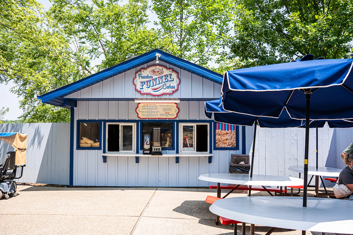 Funnel Cakes and Fried Oreos. Located next to Hoosier Celebration Theater in 4th of July.
