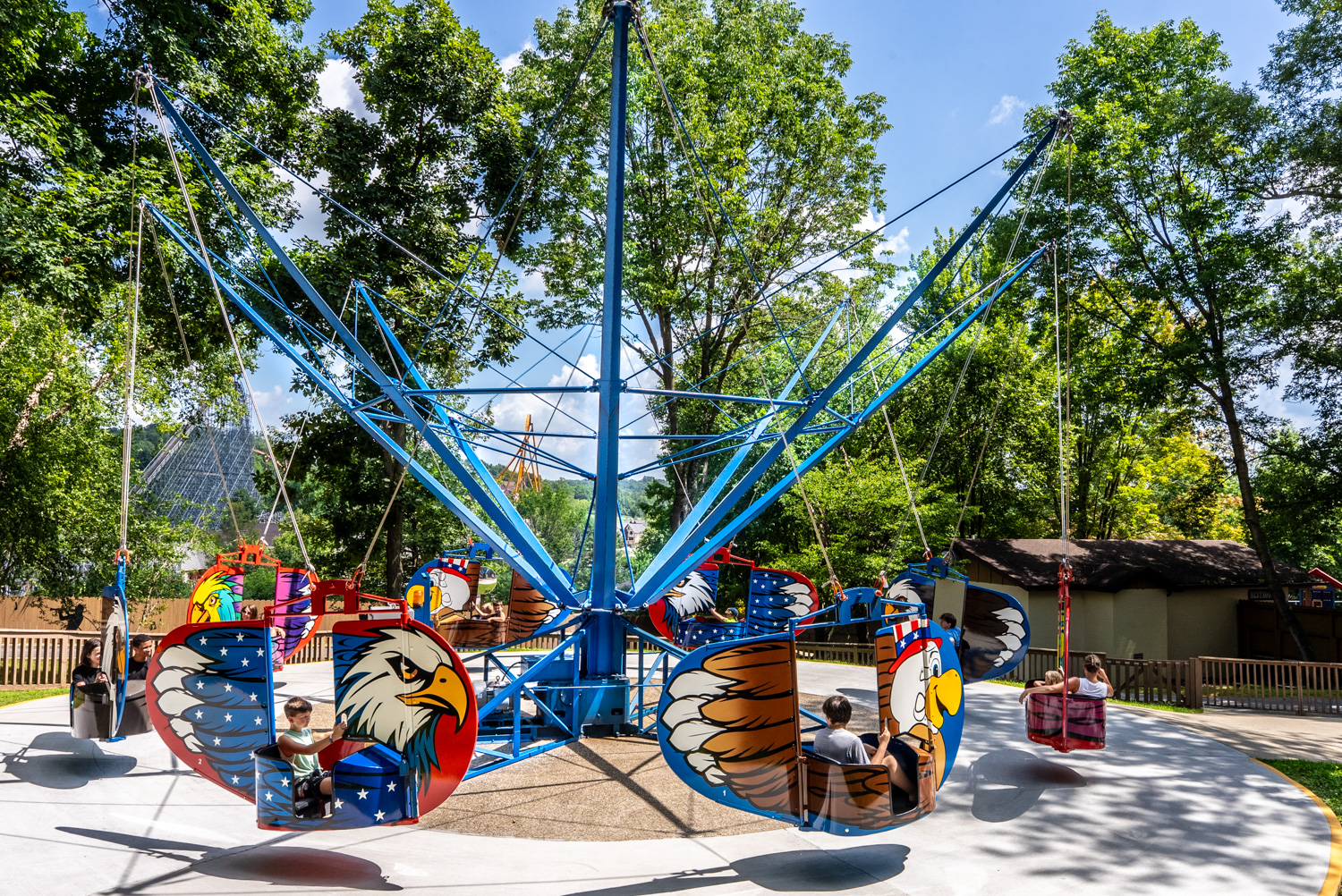 Climb into a huge colorful Eagle and enjoy this classic “flying scooter” ride. Eagles Flight is located in our Fourth of July section across from the Revolution.